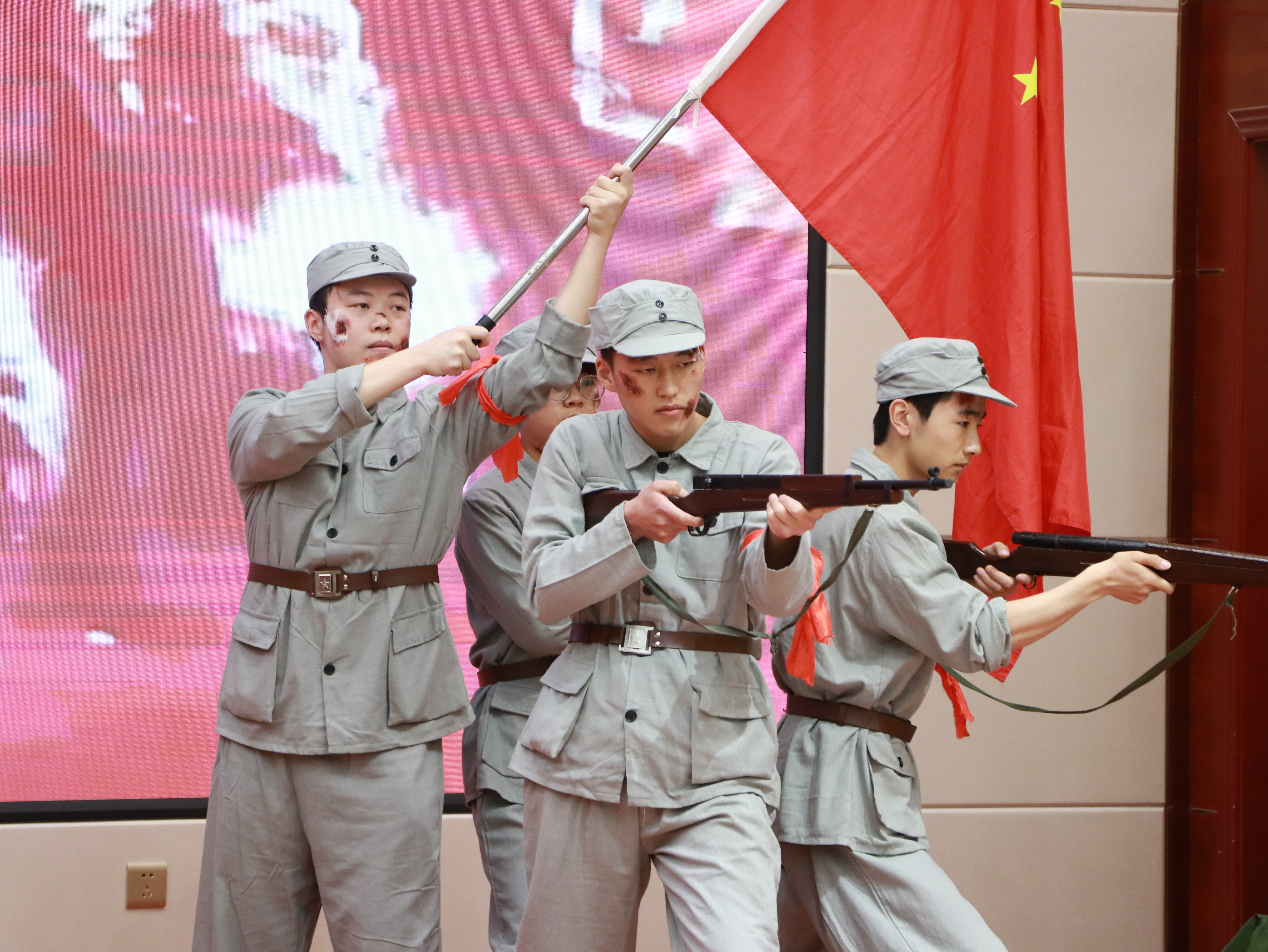 比賽現(xiàn)場,各參賽隊伍以“誦、演、歌、頌”的復合表達,帶領觀眾穿越歷史烽煙,重現(xiàn)那段氣壯山河的抗戰(zhàn)歲月。他們或慷慨激昂地講述革命先輩寧死不屈的壯舉,或手持泛黃家書深情誦讀,絕筆信中的母愛與家國大義在顫抖的聲線中重現(xiàn);或化身硝煙中的戰(zhàn)士,用染血繃帶與折斷鋼槍演繹出“十萬青年十萬軍”的悲壯群像。那些被歲月蝕刻的墨跡,此刻正在當代青年的瞳孔里重新燃燒。一句句飽含深情的誦讀,一幕幕震撼人心的演繹,都傳遞著同學們對抗戰(zhàn)英烈的深切緬懷與崇高敬意?,F(xiàn)場掌聲如潮水般此起彼伏,經(jīng)久不息,激蕩著每一位觀眾的愛國情懷。