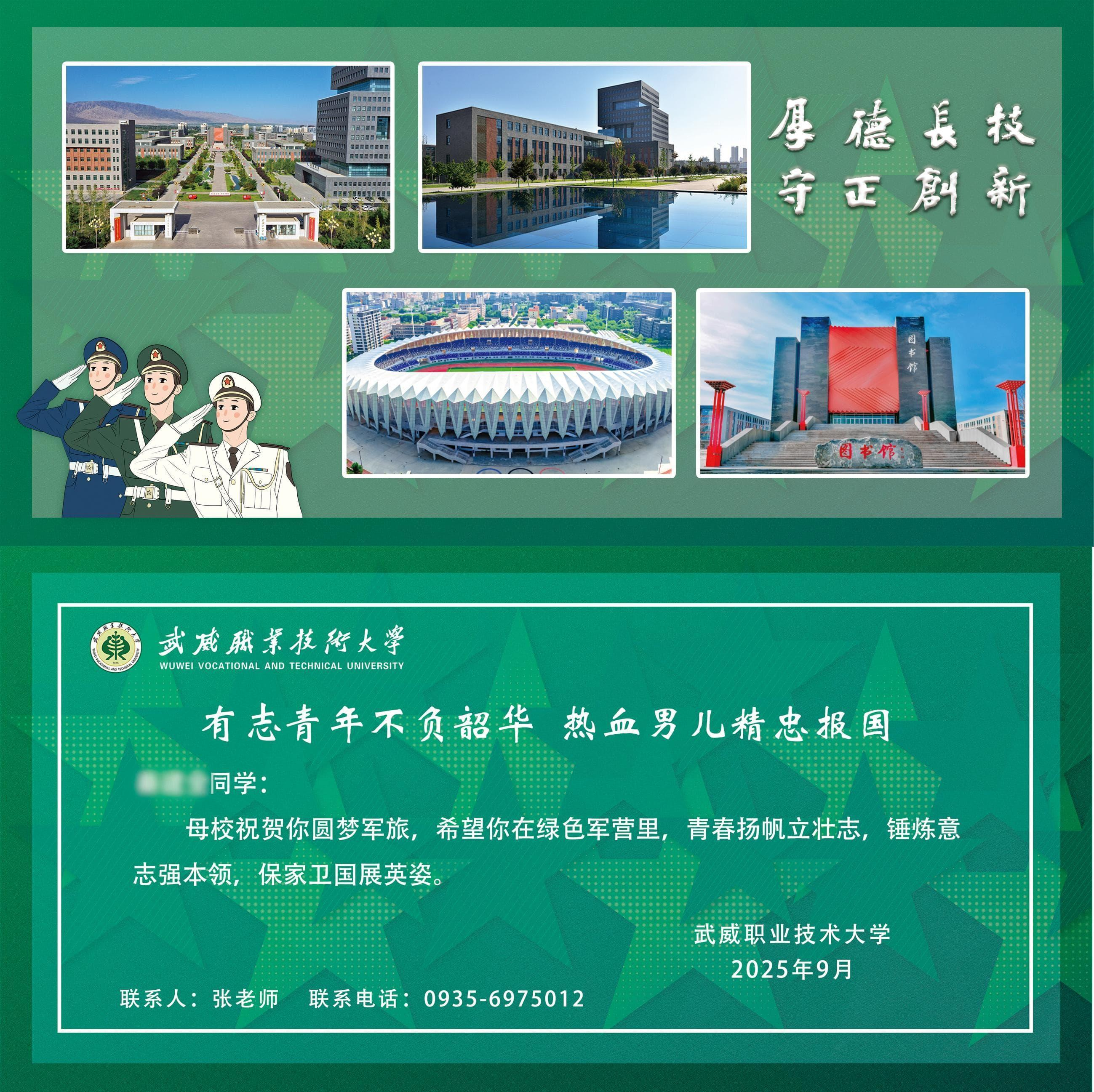 從戎報(bào)國(guó)英雄志,建功立業(yè)正當(dāng)時(shí)。經(jīng)歷嚴(yán)謹(jǐn)?shù)捏w檢篩選、政治審查,以及役前集訓(xùn)的磨礪淬煉,武威職業(yè)技術(shù)大學(xué)19名有志青年身披戎裝,即將離開(kāi)母校進(jìn)入軍營(yíng),奔赴國(guó)防一線,以青春之名赴山河之約,用熱血擔(dān)當(dāng)書(shū)寫(xiě)保家衛(wèi)國(guó)的嶄新篇章。9月15日,學(xué)生工作部(征兵工作站)工作人員和各二級(jí)學(xué)院輔導(dǎo)員、班主任代表前往武威市役前教育訓(xùn)練基地對(duì)參軍學(xué)生進(jìn)行慰問(wèn),為他們送行。