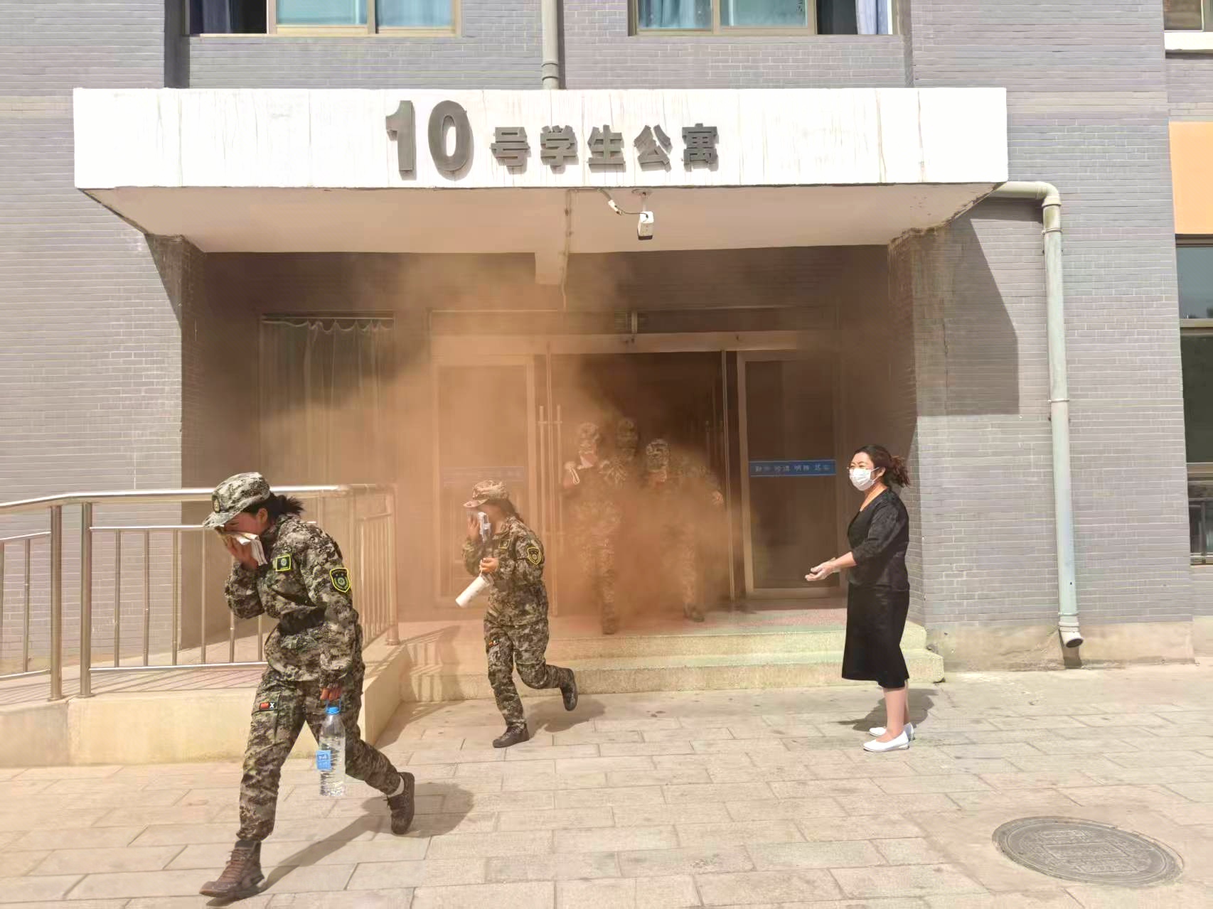 14時30分,疏散演練正式開始。隨著火災(zāi)警報響起,安全保衛(wèi)工作人員點燃煙餅,在學(xué)生公寓樓模擬火災(zāi)現(xiàn)場,冒出滾滾濃煙,公寓管理人員迅速組織學(xué)生有序疏散。在輔導(dǎo)員、班主任的引導(dǎo)下,同學(xué)們按照疏散要領(lǐng)和疏散路線,快速、有序地撤離至體育場。