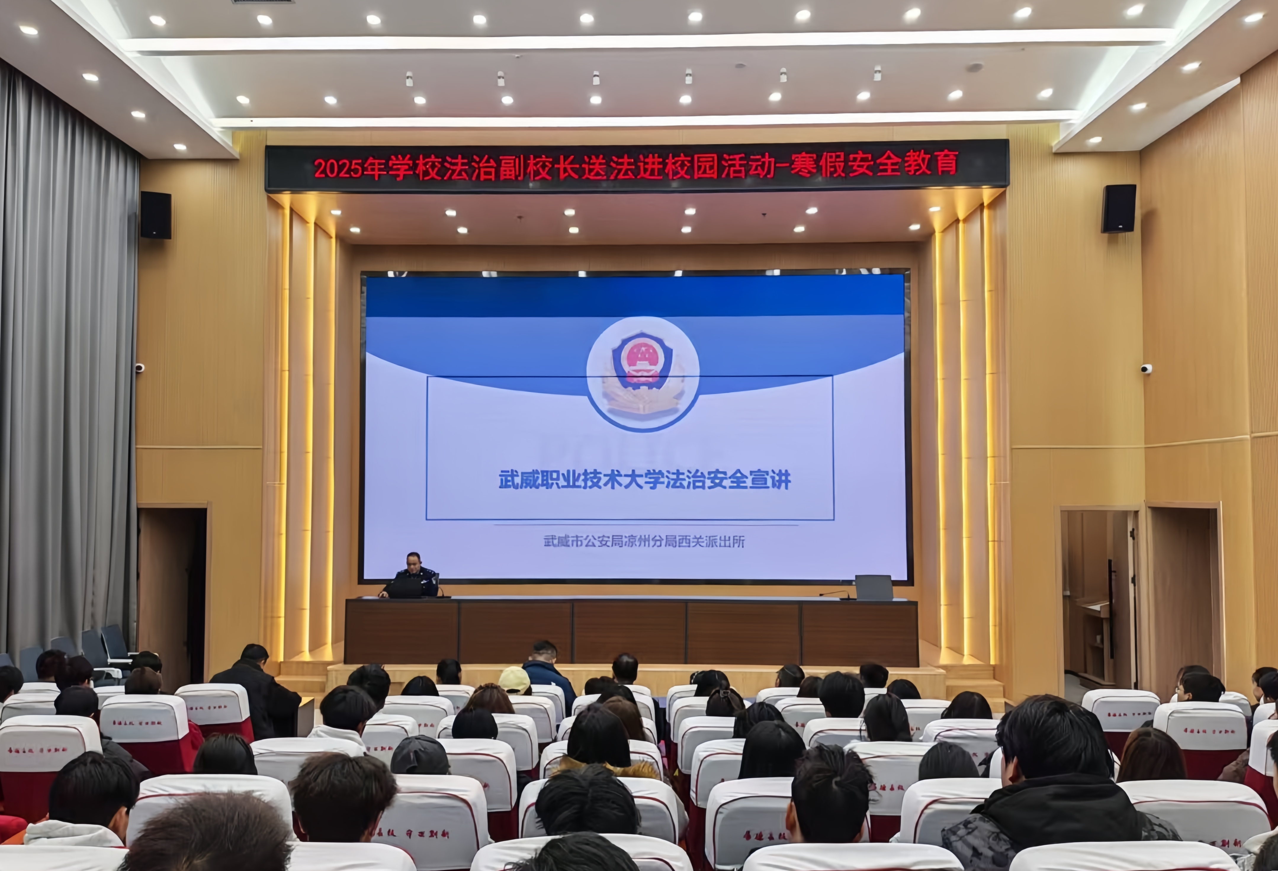 為切實增強師生法治觀念與安全防范意識,筑牢校園安全防線,12月30日,學(xué)校法治副校長送法進(jìn)校園專題宣講活動在能源科技樓一樓學(xué)術(shù)報告廳舉行,各學(xué)院輔導(dǎo)員及學(xué)生代表共計110余人參加活動。
