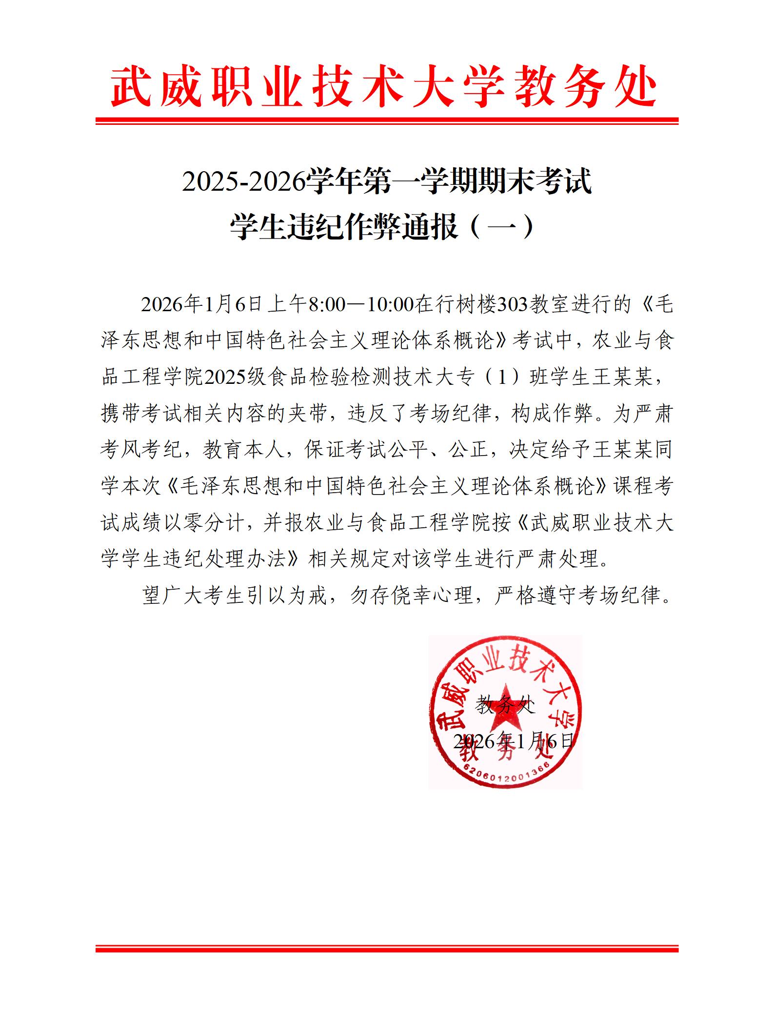 2025-2026學(xué)年第一學(xué)期期末考試學(xué)生違紀(jì)作弊通報(bào)(一)