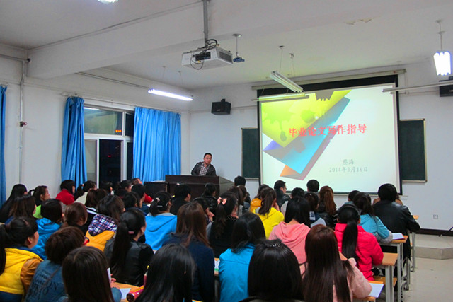 系主任晏素珍對本次畢業(yè)生畢業(yè)論文(設(shè)計(jì))做了三點(diǎn)要求,一是全體畢業(yè)生要高度重視畢業(yè)論文(設(shè)計(jì))的寫作;二是嚴(yán)格按照指導(dǎo)教師的要求保質(zhì)保量的完成論文;三是每位指導(dǎo)老師對論文指導(dǎo)工作要認(rèn)真負(fù)責(zé)、耐心細(xì)致。蔡海老師做了題為《畢業(yè)生論文寫作指導(dǎo)》的報(bào)告,主要從論文格式要求、文獻(xiàn)查詢方法、論文寫作方法三個(gè)方面給同學(xué)們做了深入淺出的講解,受到同學(xué)們的熱烈歡迎。