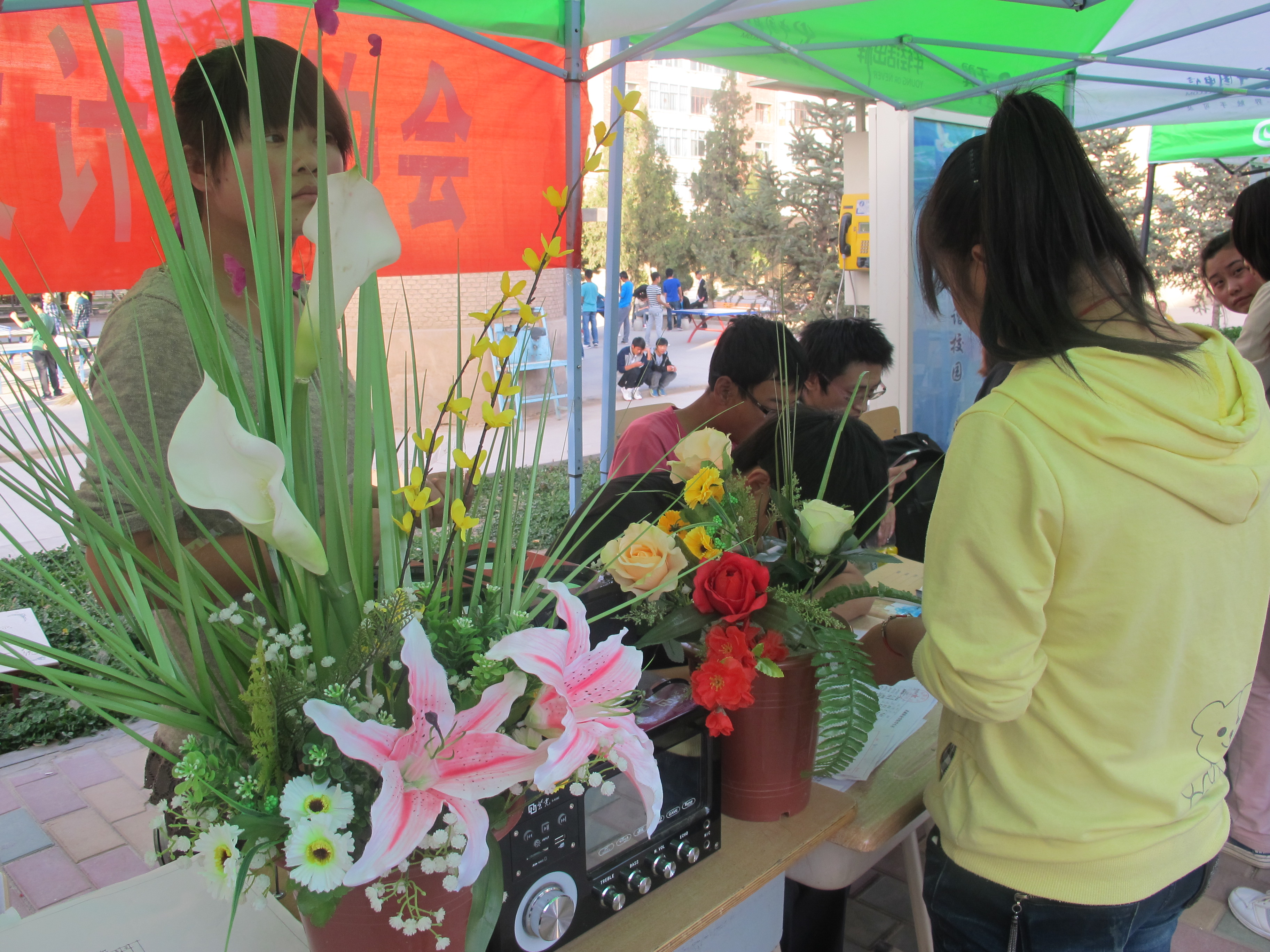1010,在武威職業(yè)學(xué)院社團(tuán)活動(dòng)日,農(nóng)業(yè)經(jīng)濟(jì)系團(tuán)總支聯(lián)合花語(yǔ)插花社向廣大2013級(jí)新生展示插花藝術(shù)。