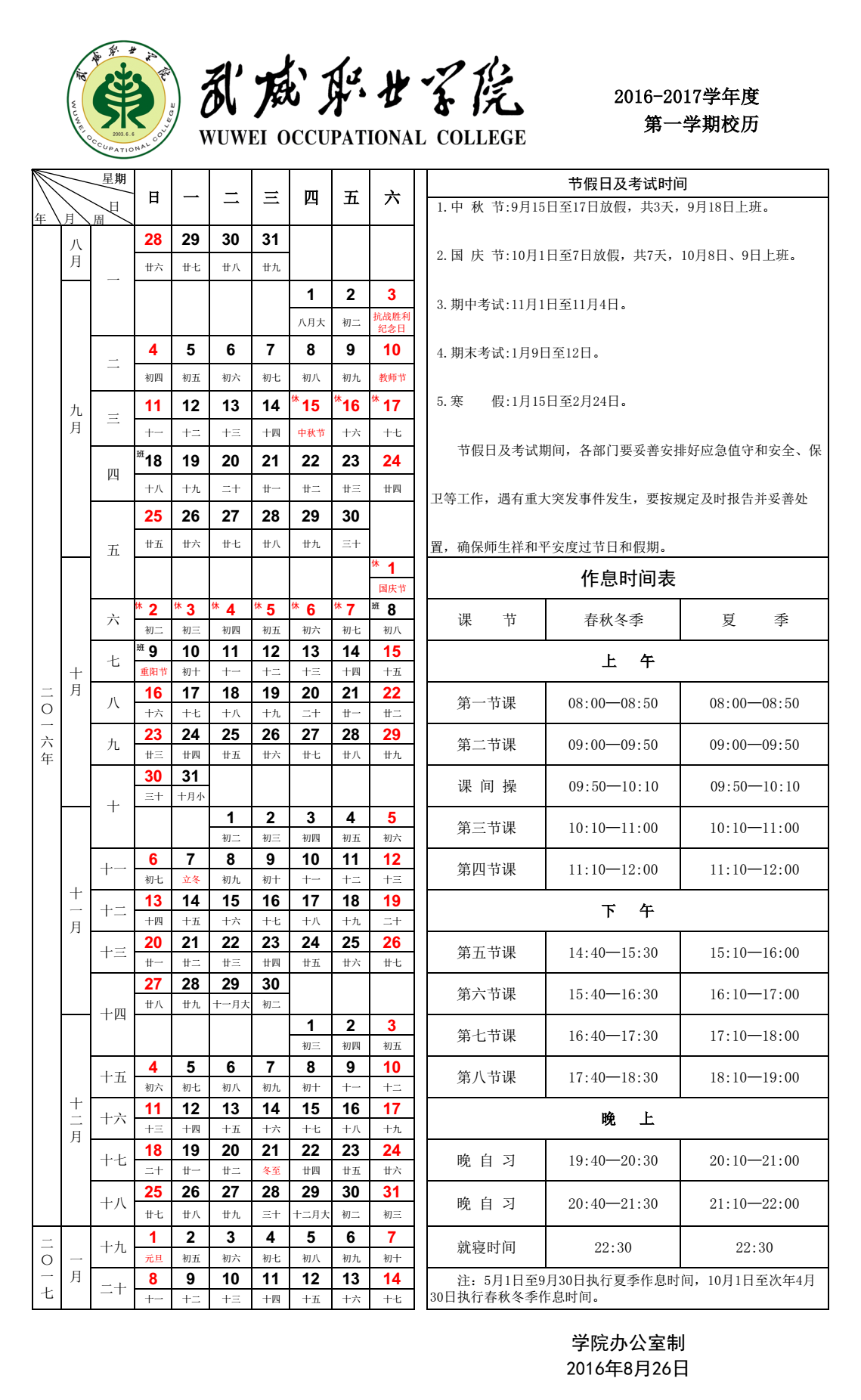 2016-2017學(xué)年度 第一學(xué)期校歷