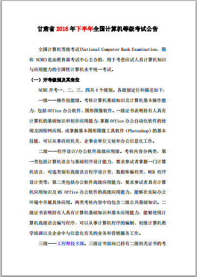 5.詳細信息請參看甘肅省教育考試院《關于做好2016年9月全國計算機等級考試網(wǎng)上報名工作的通知》(甘教考院〔2016〕95號文件)及《甘肅省2016下半年全國計算機等級考試公告》(已傳至群文件)。