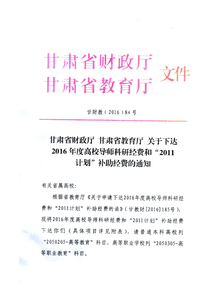 轉(zhuǎn)發(fā)甘肅省財政廳 教育廳文件 關(guān)于下達(dá)2016年度高校導(dǎo)師科研經(jīng)費(fèi)和“2011計劃”補(bǔ)助經(jīng)費(fèi)的通知