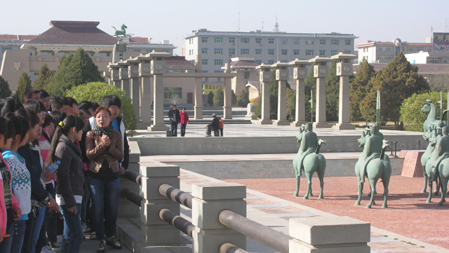 同學(xué)們?cè)谥v解員的帶領(lǐng)下,首先從漢風(fēng)格大門"中華第一門"開始、參觀了天下第一馬"馬踏飛燕"、凝聚漢文化精粹的巨型浮雕、牌樓、圖騰柱以及堪稱"世界之最"的整體放大6倍的99件銅車馬儀仗俑隊(duì)列,最后參觀了雷臺(tái)漢文化陳列館.