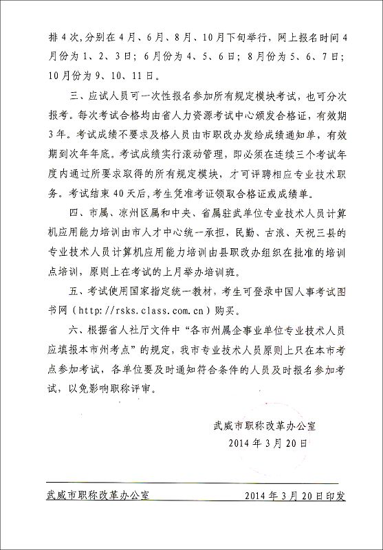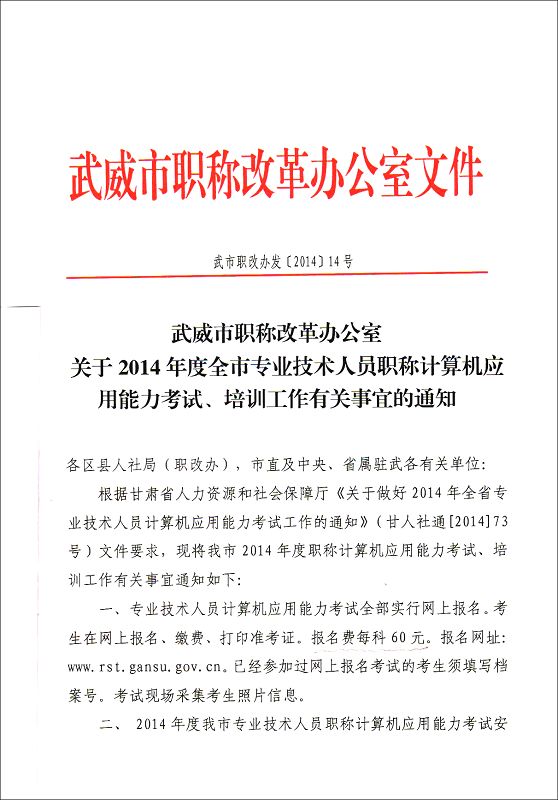 <轉(zhuǎn)>武威市職稱改革辦公室關(guān)于2014年度全市專業(yè)技術(shù)人員職稱計算機應用能力考試、培訓工作有關(guān)事宜的通知