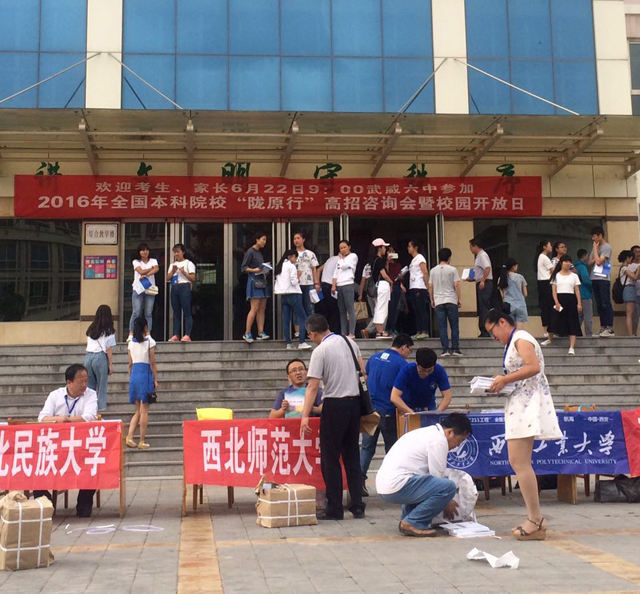 為使今年參加高考的考生能夠更全面、更直接地了解我省普通高校的招生政策、辦學(xué)特色和專(zhuān)業(yè)優(yōu)勢(shì),科學(xué)合理地填報(bào)高考志愿,由甘肅日?qǐng)?bào)社主辦,省內(nèi)主要高校協(xié)辦的“行進(jìn)隴原·服務(wù)高考”2016高校招生全省巡回推介武威站推介活動(dòng)于6月22在涼州區(qū)文化廣場(chǎng)(南廣場(chǎng))舉行,我院招生就業(yè)處選派老師參加了此次咨詢推介活動(dòng)。