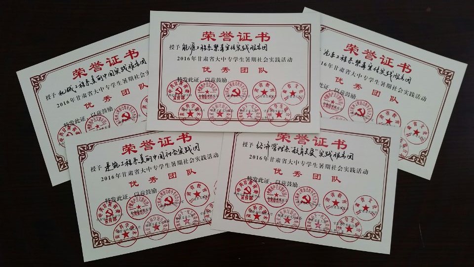 學(xué)院團(tuán)委被省委宣傳部、團(tuán)省委、省教育廳等九個(gè)部門評(píng)為2016年甘肅省大中專學(xué)生暑期社會(huì)實(shí)踐活動(dòng)“優(yōu)秀組織單位”,五個(gè)實(shí)踐團(tuán)隊(duì)被評(píng)為省級(jí)“優(yōu)秀團(tuán)隊(duì)”,五名同志被評(píng)為“先進(jìn)個(gè)人”,五名教師被評(píng)為 “優(yōu)秀指導(dǎo)教師”。(供稿:院團(tuán)委 馬琪)