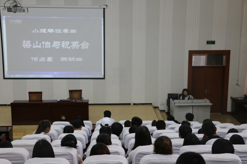 伴著優(yōu)美的音樂旋律王敏副教授開始了講座,王老師首先介紹了音樂發(fā)展歷史和音樂鑒賞的基礎(chǔ)知識,然后以我國著名作曲家陳鋼、何占豪先生創(chuàng)作的小提琴協(xié)奏曲《梁山伯與祝英臺》為題材,分階段講述了“鳥語花香”、“草橋結(jié)拜”、“英臺抗婚”、“投墳化蝶”等內(nèi)容和藝術(shù)場景。剖析了作品在管樂、和以小提琴、大提琴為主的弦樂及民樂有機(jī)結(jié)合的高超藝術(shù)境界,講座過程中王老師結(jié)合《梁祝》協(xié)奏曲音視頻資料,演繹了梁山伯與祝英臺凄美的愛情故事。