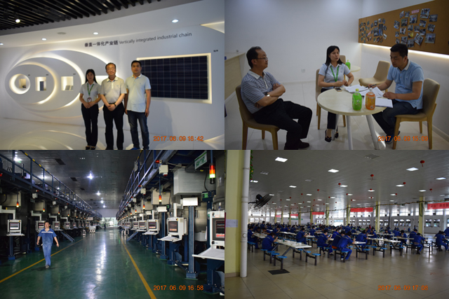 晶科能源控股有限公司是全球為數(shù)不多的擁有垂直一體化產(chǎn)業(yè)鏈的光伏制造企業(yè),業(yè)務涵蓋了優(yōu)質(zhì)的硅錠、硅片、電池片生產(chǎn)、高效單多晶光伏組件制造以及光伏電站建設(shè)等領(lǐng)域,是目前全球光伏組件生產(chǎn)的龍頭企業(yè),2016年中國500強企業(yè)。公司負責人帶領(lǐng)考察人員參觀了公司現(xiàn)代化的生產(chǎn)車間、晶科商學院、員工宿舍和食堂,介紹了公司的發(fā)展情況和用人需求。在考察過程中,考察人員就公司給學生提供的工作崗位、待遇、住宿、安全管理等情況與企業(yè)負責人進行了深入交流。