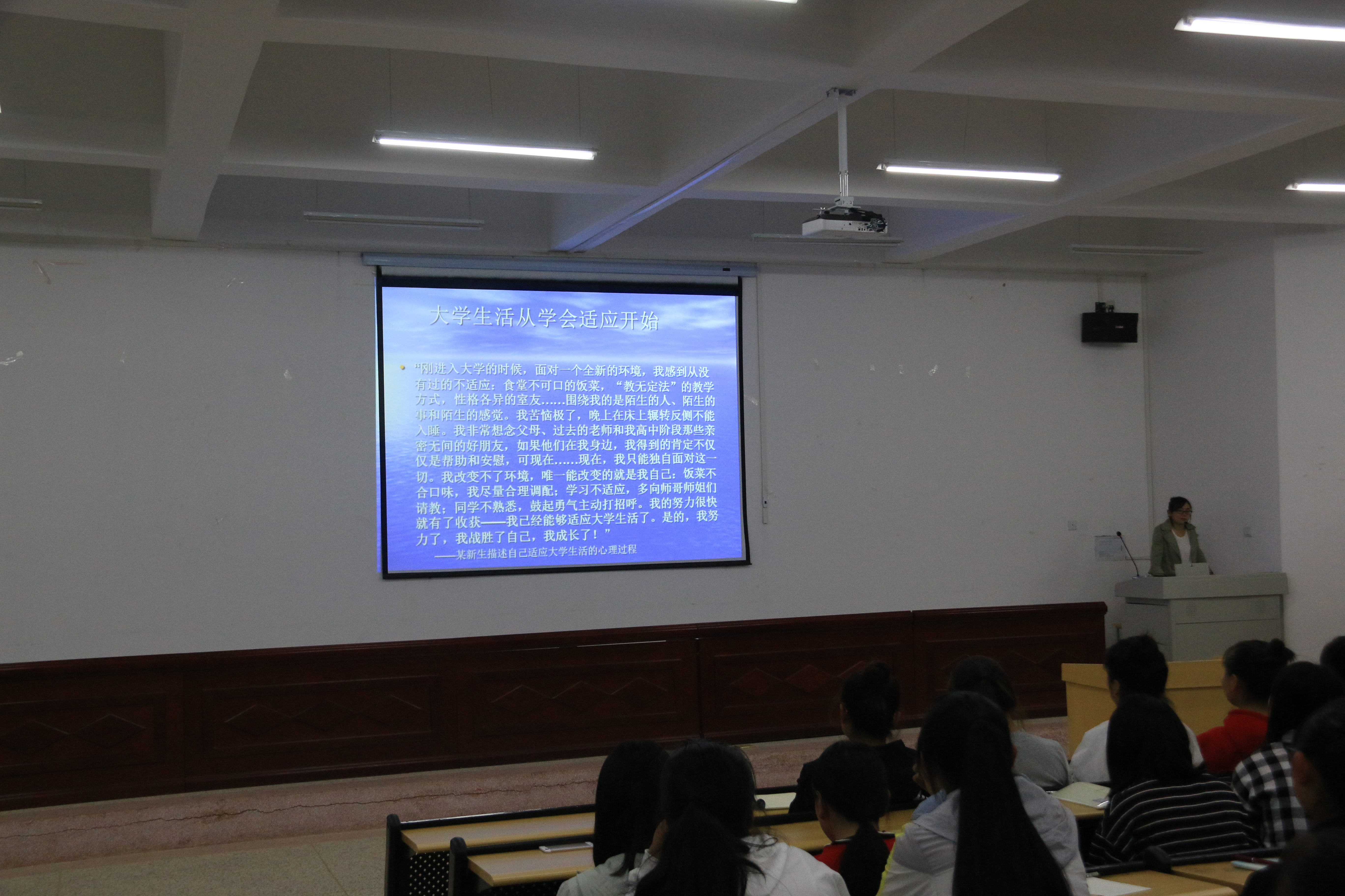 劉菊蓮老師主要針對(duì)大一新生面對(duì)新的環(huán)境、新的學(xué)習(xí)狀況及新的人際變化這三方面新生適應(yīng)問(wèn)題的表現(xiàn)談了具體的解決方法,面對(duì)新生活出現(xiàn)的心理困惑,通過(guò)豐富的案例、簡(jiǎn)單易懂的道理、風(fēng)趣幽默的講解,讓晦澀的理論變得淺顯易懂,為我院大學(xué)生帶來(lái)一次心理的洗禮。