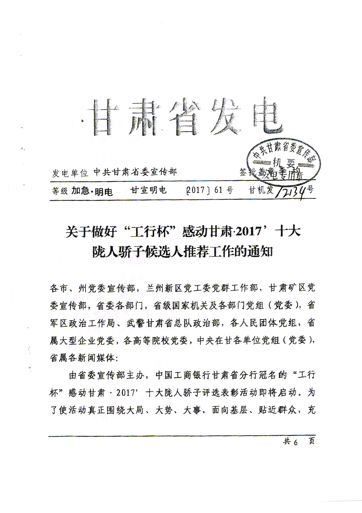 關(guān)于推薦“工行杯”感動(dòng)甘肅?2017十大隴人驕子候選人的工作通知